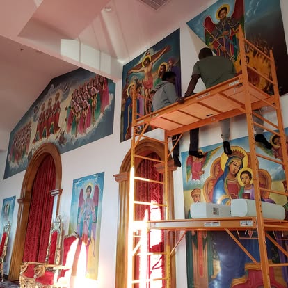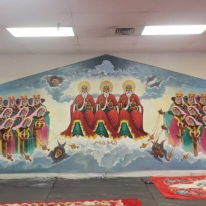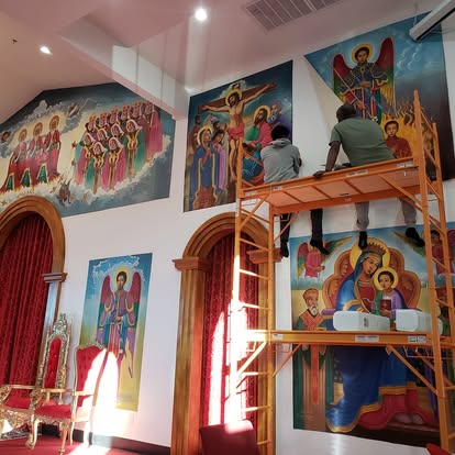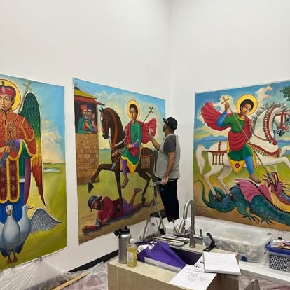 I have the honor of creating the full iconographic for Debre Bisrat St. Gabriel Ethiopian Orthodox Tewahedo Church in Las Vegas—an ongoing and deeply meaningful project. This work is rooted in the sacred tradition of Ethiopian religious art, a visual language developed over centuries within the Ethiopian Orthodox Church. Known for its vibrant colors, frontal figures, and symbolic clarity, Ethiopian iconography is not merely decorative—it is devotional. It serves as a spiritual bridge between the earthly and the divine, guiding worshippers into prayer, memory, and sacred presence.