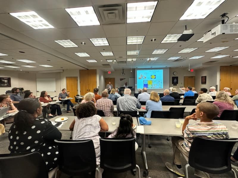 Eyob Mergia explains the process of creating art Feb. 8 at The Studio at the Sahara West Library, 9600 W. Sahara Ave. The piece by his elbow, one of a 12-panel piece of work that named for the exhibit, “The Philosophy of Form and Color, ” is actually the palette where he mixed colors for the other panels. Jan Hogan/View