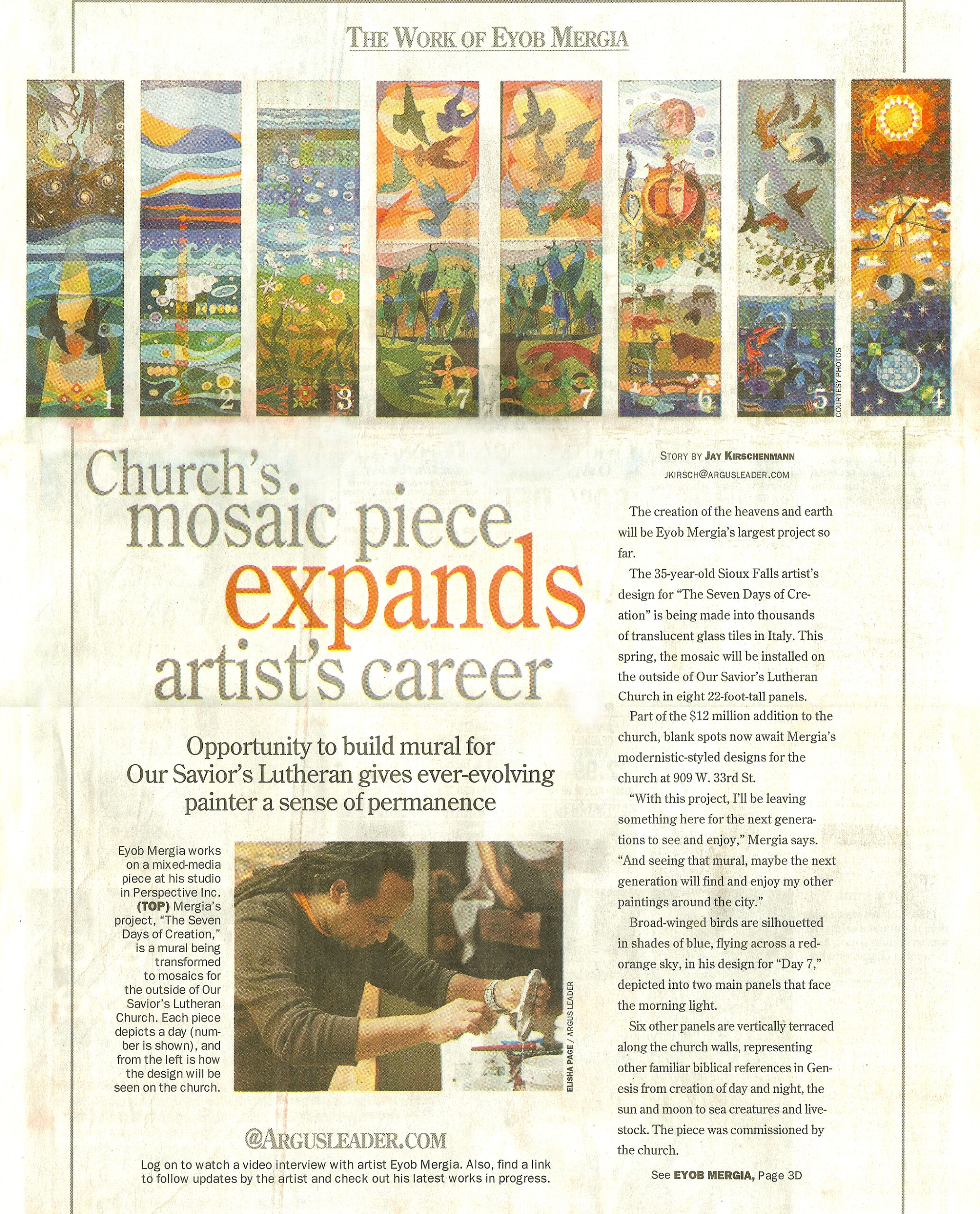 In Seven Days of Creation , Mergia offers a compelling visual interpretation of the opening verses of Genesis—the foundational Old Testament narrative that describes the ordered creation of the world. Commissioned for a church architectural project, the artist submitted seven original paintings, each corresponding to a day in the biblical account. These works were later selected for transformation into large-scale exterior glass mosaic murals. The first six days—filled with dynamic acts of separation, formation, and life—provided Mergia with vivid visual material. However, his depiction of the seventh day, the day of divine rest, emerged more intuitively. Unlike the others, it was shaped through a process of deep prayer and contemplation, inviting viewers into a space of spiritual stillness and reflection.
