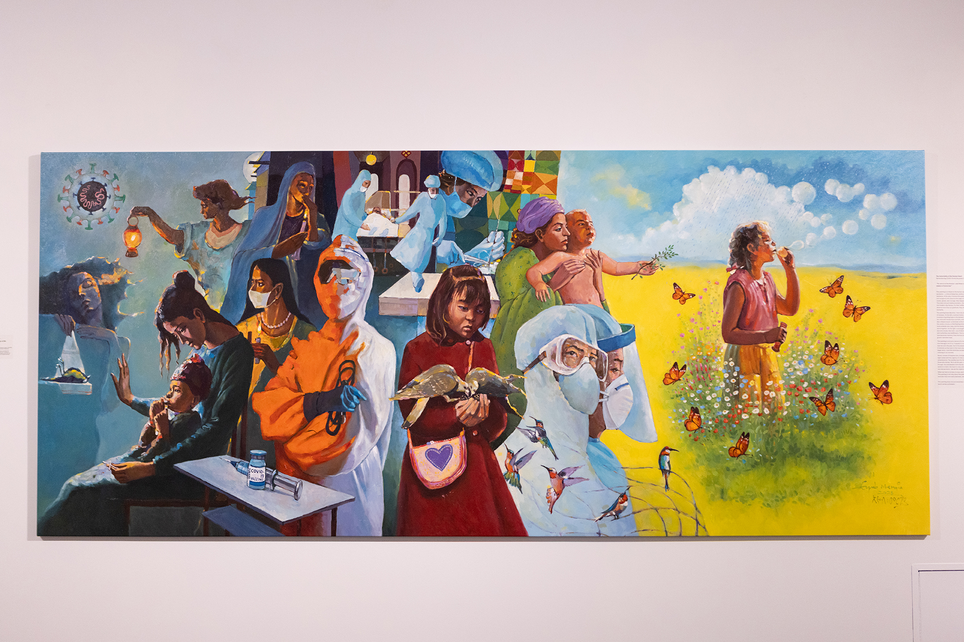 More than a record of a moment, this work expresses a universal truth about our shared human experience: how we carry the past, live in the present, and imagine the future. Scenes of hospital care, emergency rooms, and candlelight vigils evoke both the urgency of crisis and the sacredness of remembrance. Through all this, something deeper shines: the unshakable truth that we are still here, with the wisdom to learn, the heart to care, and the strength to heal. When we hold on to love, to care, and to one another, we begin again. This painting does not merely remember; it endures. It lives, breathes, and carries us forward. It is currently on exhibit at the Washington Pavilion in Sioux Falls, S.D., and after the exhibition concludes, it will be installed at the Sanford Medical School.